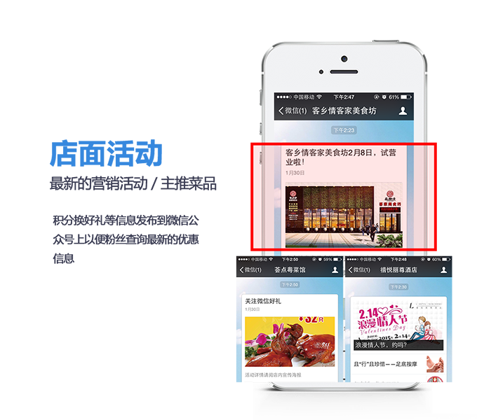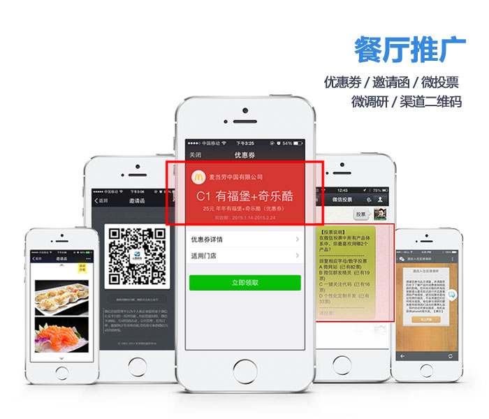 例如,新菜品上市,免费试吃等;c、投票、调研系统:菜品投票、服务调研,随时随地的完成调查,
