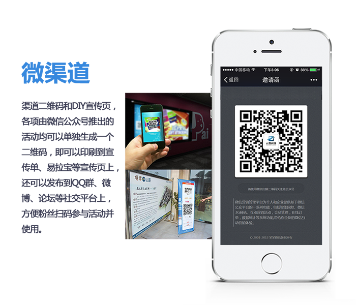 帮助企业搜集市场数据,消费者满意度调查;d、微渠道:渠道二维码和DIY宣传页,